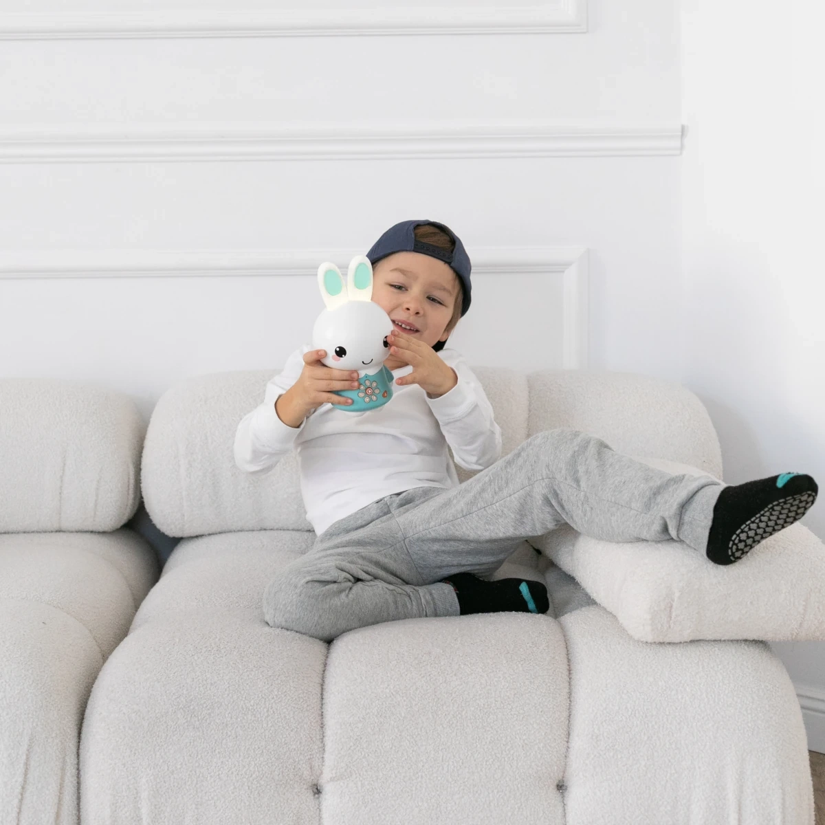 G6PRO został zaprojektowany z myślą o najmłodszych użytkownikach. Jest wyjątkowo prosty w obsłudze – nawet małe rączki poradzą sobie z intuicyjnymi przyciskami. Specjalny przycisk umożliwia łatwe włączenie kolekcji kojących dźwięków, które automatycznie wyłączą się po 30 minutach, co ułatwia zasypianie. Króliczek wykonany jest z wytrzymałego tworzywa ABS, które jest 30 razy mocniejsze niż zwykły plastik, gwarantując odporność na wstrząsy i upadki. Bezpieczeństwo dziecka zapewniają atestowane materiały zgodne z normami UE i Wielkiej Brytanii oraz standardami RoHS. Miękkie uszy i przyciski wykonane są z bezpiecznego silikonu.