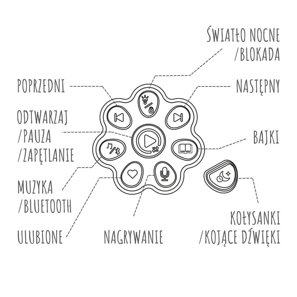 Interaktywna zabawka z bogatą biblioteką piosenek i bajek, lampką nocną, Bluetooth i dyktafonem. Bluetooth pozwala na słuchanie ulubionych utworów. Wspiera rozwój, wycisza przed snem i daje radość odkrywania każdego dnia.