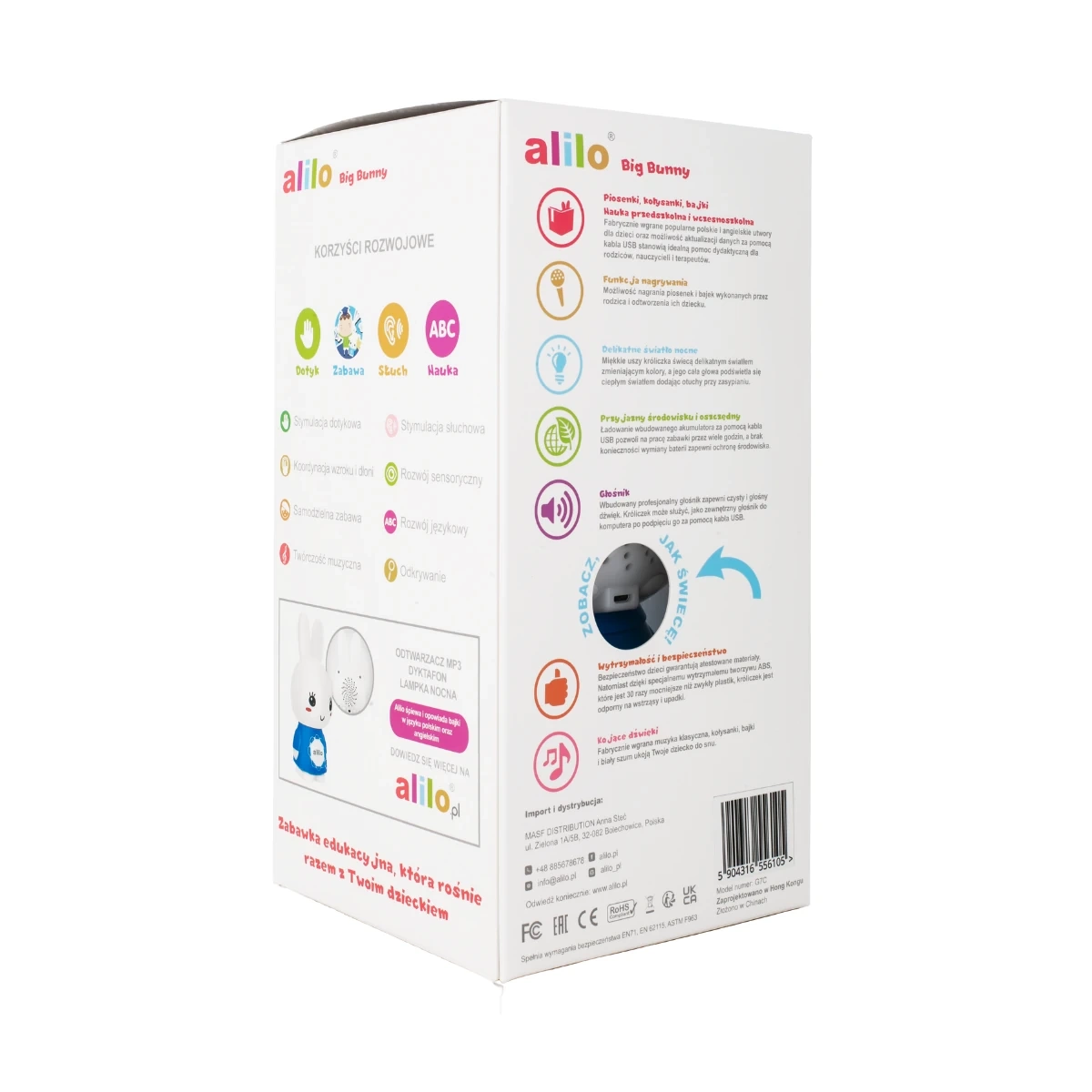 Króliczek Alilo Big Bunny G7C to wyjątkowa zabawka edukacyjna, która będzie towarzyszyć Twojemu dziecku przez wiele lat. Łącząc funkcje odtwarzacza MP3, dyktafonu, lampki nocnej i głośnika komputerowego, króliczek zapewnia wszechstronną stymulację sensoryczną i wspiera rozwój kluczowych umiejętności. Wykonany z najwyższej jakości materiałów, bezpiecznych dla dzieci, stanowi doskonały wybór na prezent dla maluchów w każdym wieku.