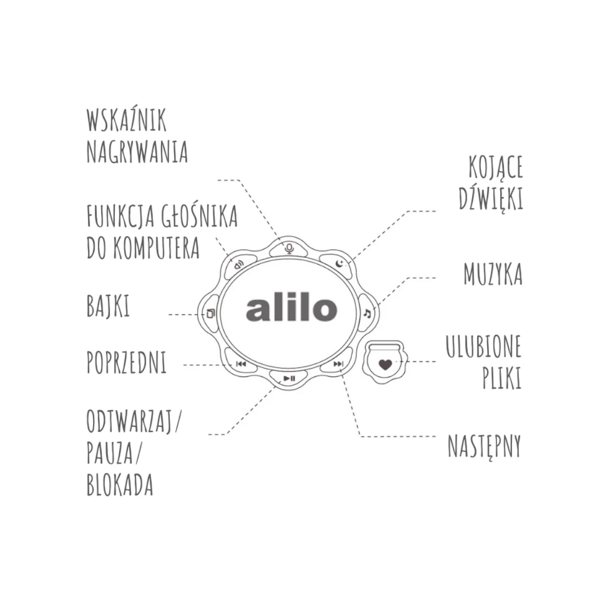 Alilo Big Bunny G7C posiada fabrycznie wgraną bogatą bibliotekę utworów w języku polskim i angielskim. To doskonałe narzędzie do nauki języka i rozwoju umiejętności muzycznych dziecka. W pamięci króliczka znajdują się popularne piosenki, kołysanki, bajki oraz kojące dźwięki, które umilą czas Twojemu maluchowi.