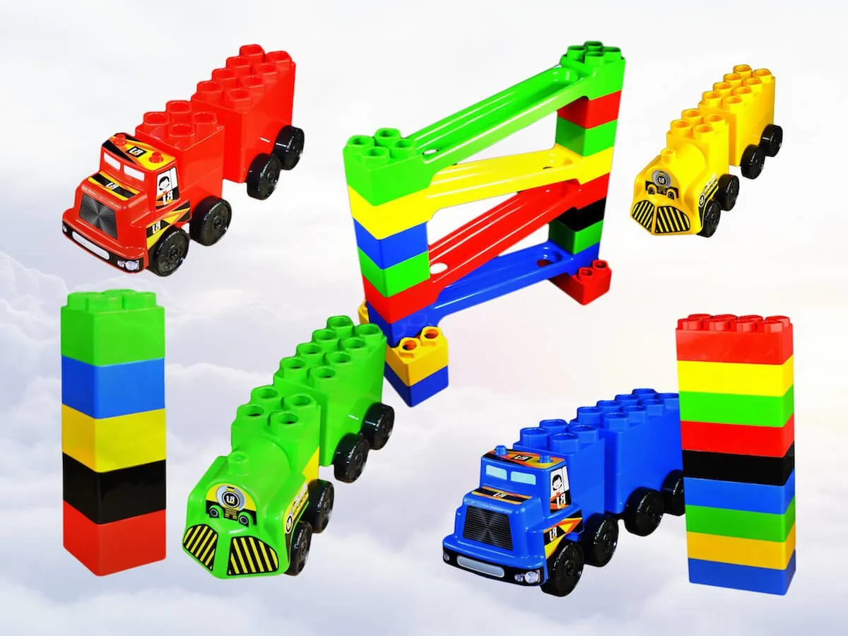 Koła i kabiny oznaczają, że budowle mogą jeździć. Zjeżdżalnia dodaje element akcji. Dziecko nie tylko buduje - potem bawi się swoimi konstrukcjami.