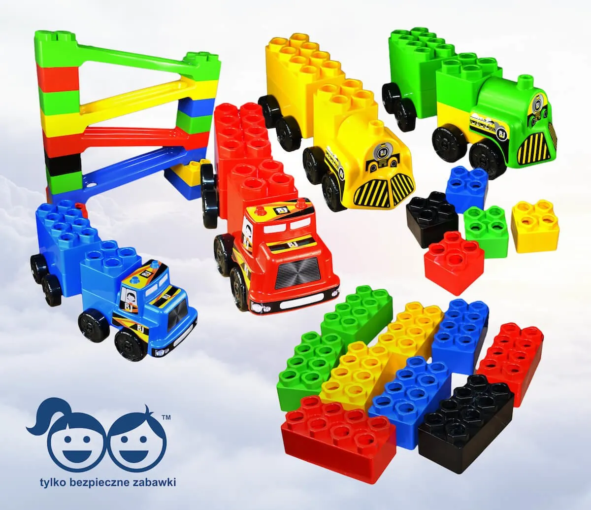 Zabawka konstrukcyjna z dużymi elementami, kabinami, kołami i zjeżdżalniami. Rozwija kreatywność, motorykę i współpracę. Bezpieczna, trwała, do zabawy w domu i ogrodzie. Dla dzieci od 4 lat, 103 elementy.