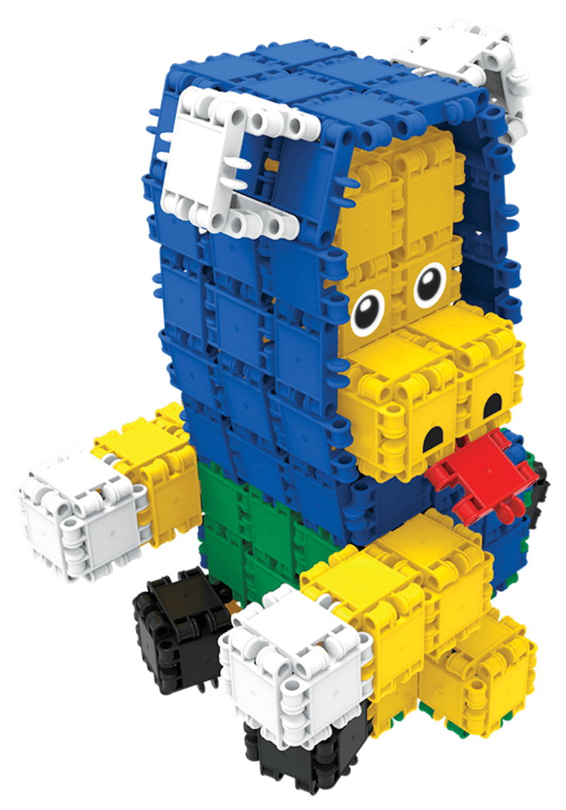 275 elementów konstrukcyjnych w różnych kolorach i kształtach. Duże wiaderko z uchwytem, instrukcja do budowy 10 modeli, naklejki. Elementy o rozmiarze 5x5 cm.