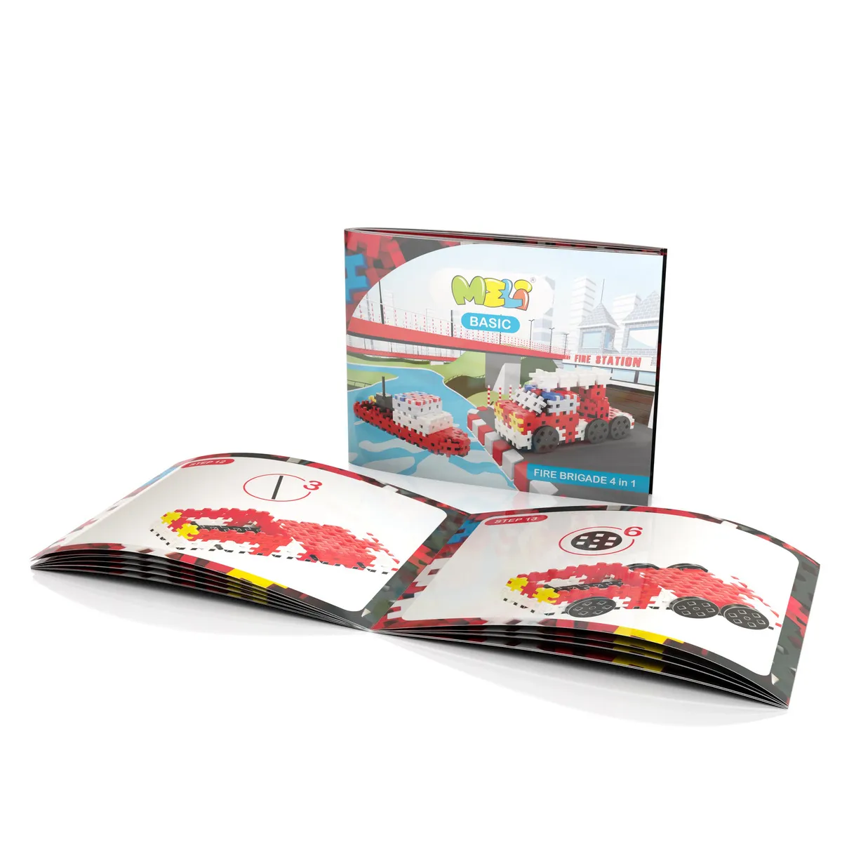 160 elastycznych klocków Meli z kołami i elementami mechanicznymi, kolorowe instrukcje do budowy 4 pojazdów strażackich: wozu gaśniczego, drabiniastego, łodzi ratunkowej i więcej.