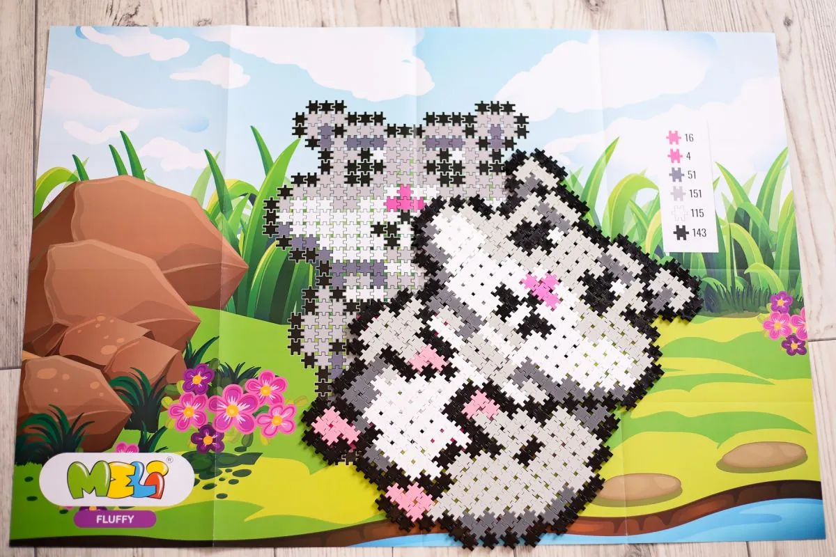 Meli Minis Fluffy 2w1 to tematyczny zestaw polskich klocków puzzlowych z planszami do budowy dwóch puchatych zwierzątek.
