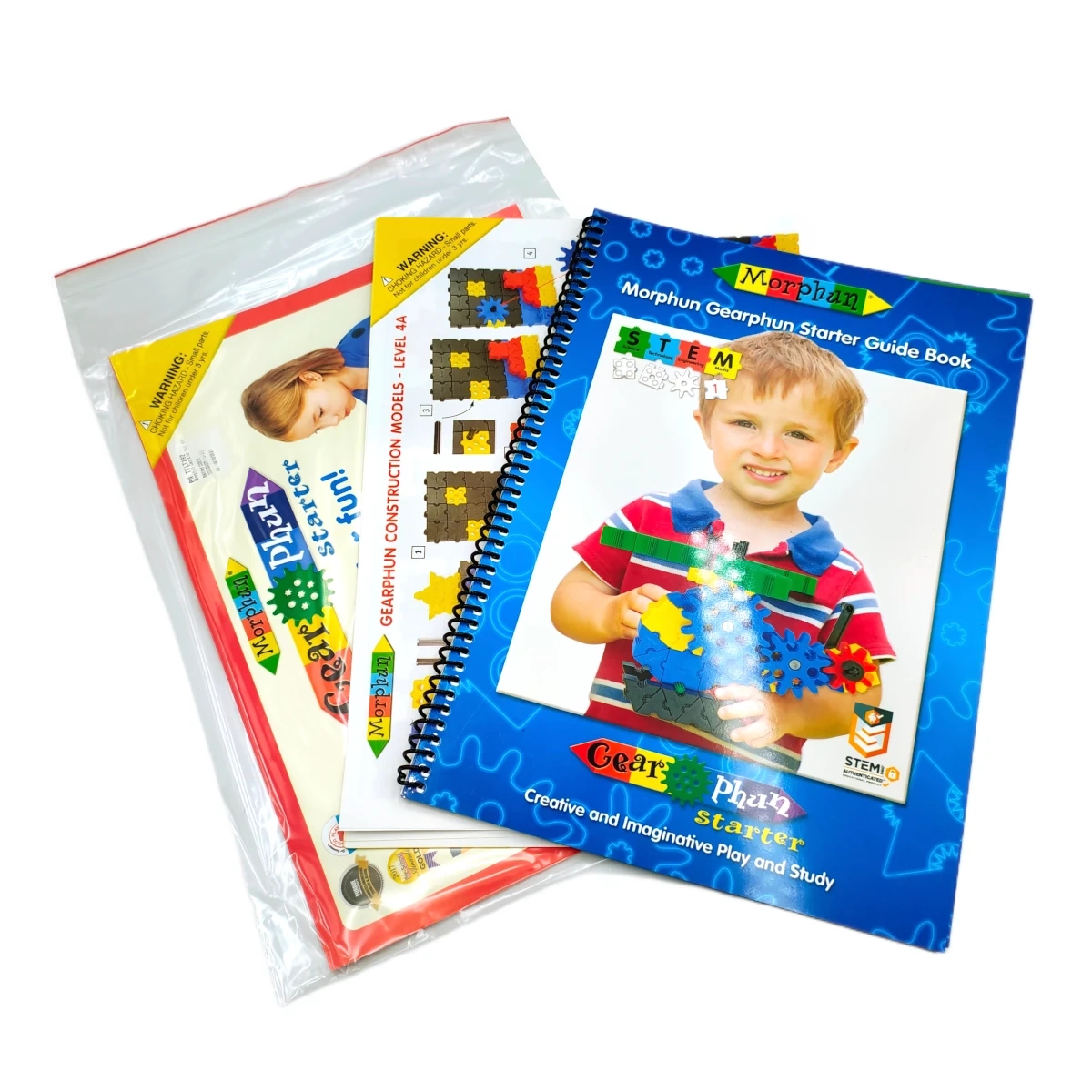 304 elementy konstrukcyjne GearPhun z kołami zębatymi o różnych rozmiarach, 60-stronicowa książka instrukcji formatu A4 z dziesiątkami projektów i wyjaśnieniami zasad mechaniki, praktyczne pudełko do przechowywania całego zestawu.