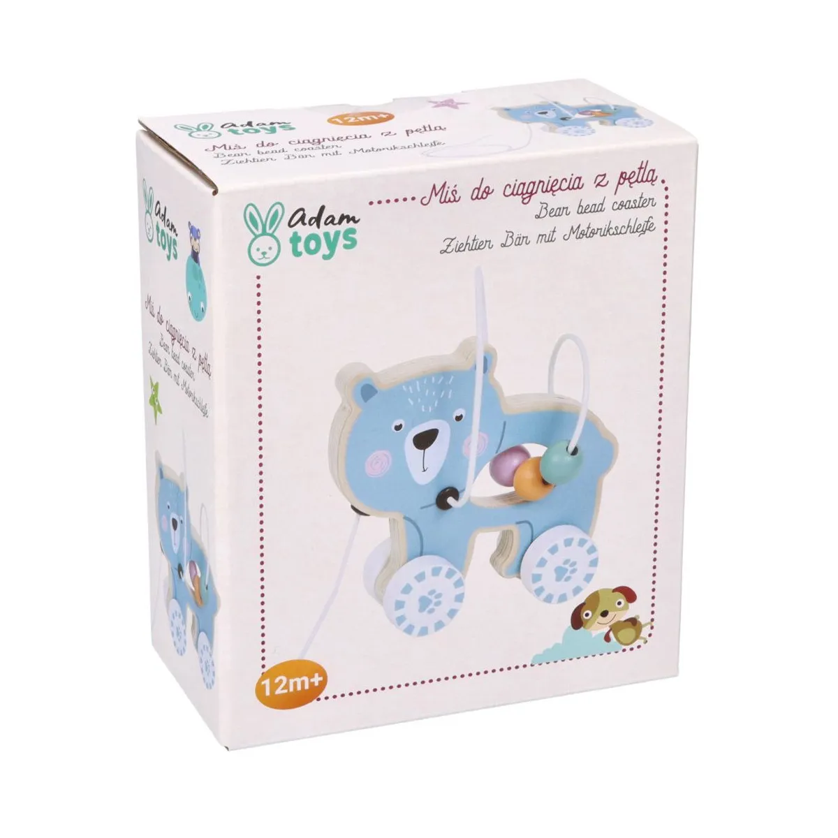 Drewniany miś na kółkach do ciągnięcia, sznurek do ciągnięcia, pętla motoryczna z koralikami na plecach misia.