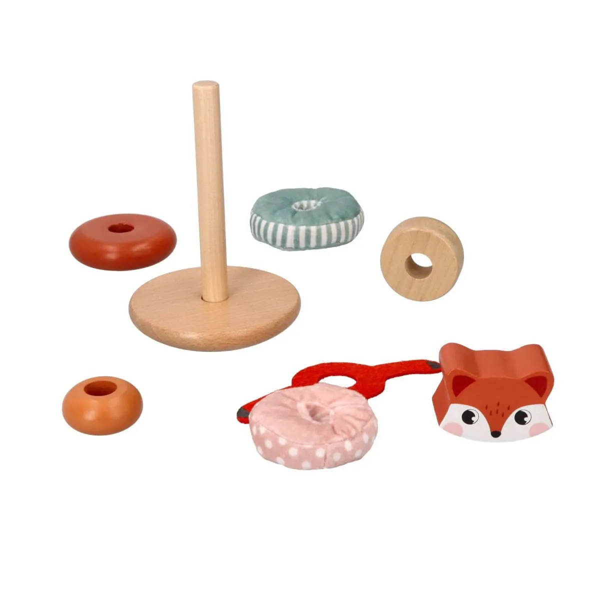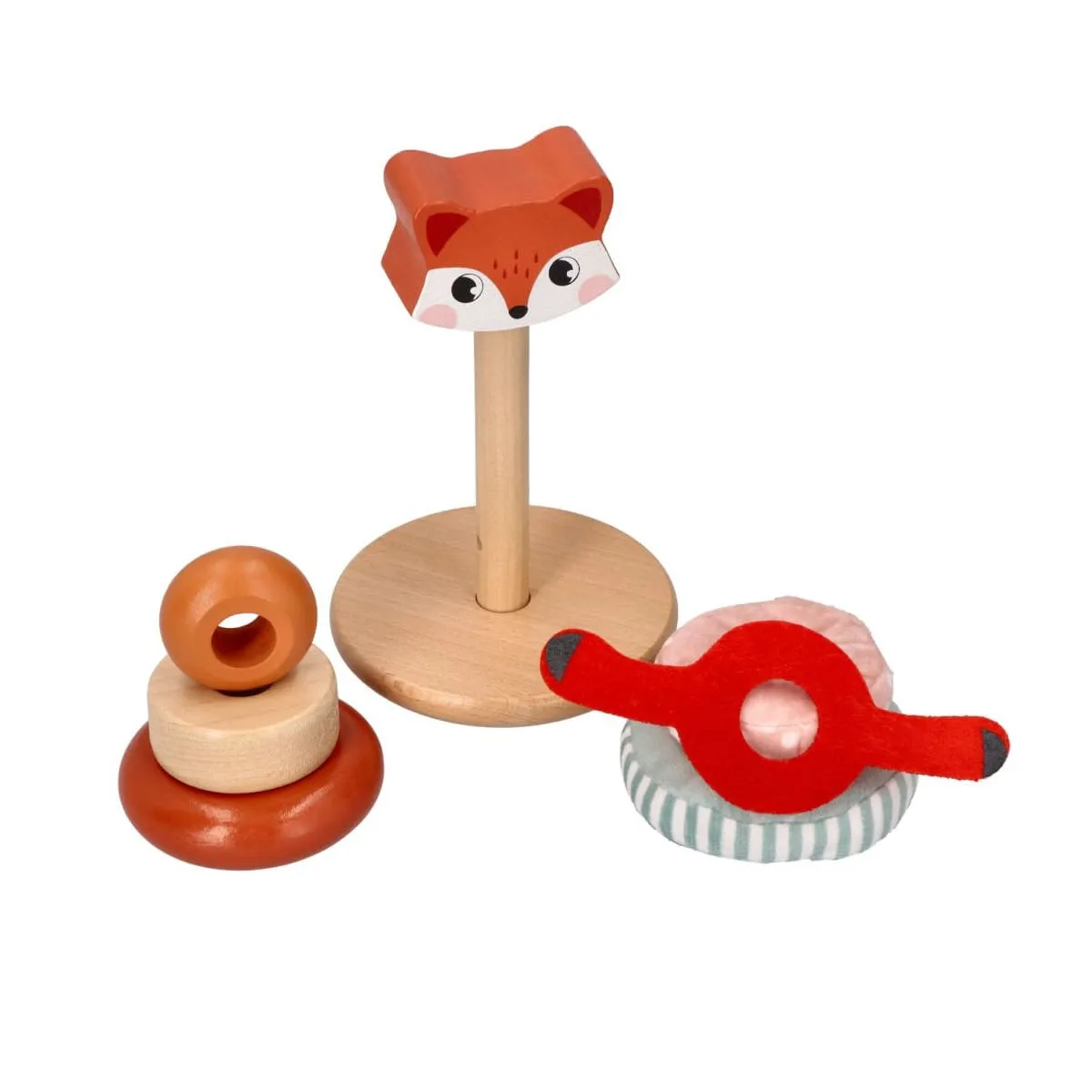 Drewniana podstawa z trzpieniem, zestaw kolorowych krążków o różnych fakturach oraz drewniana figurka liska na szczyt.
