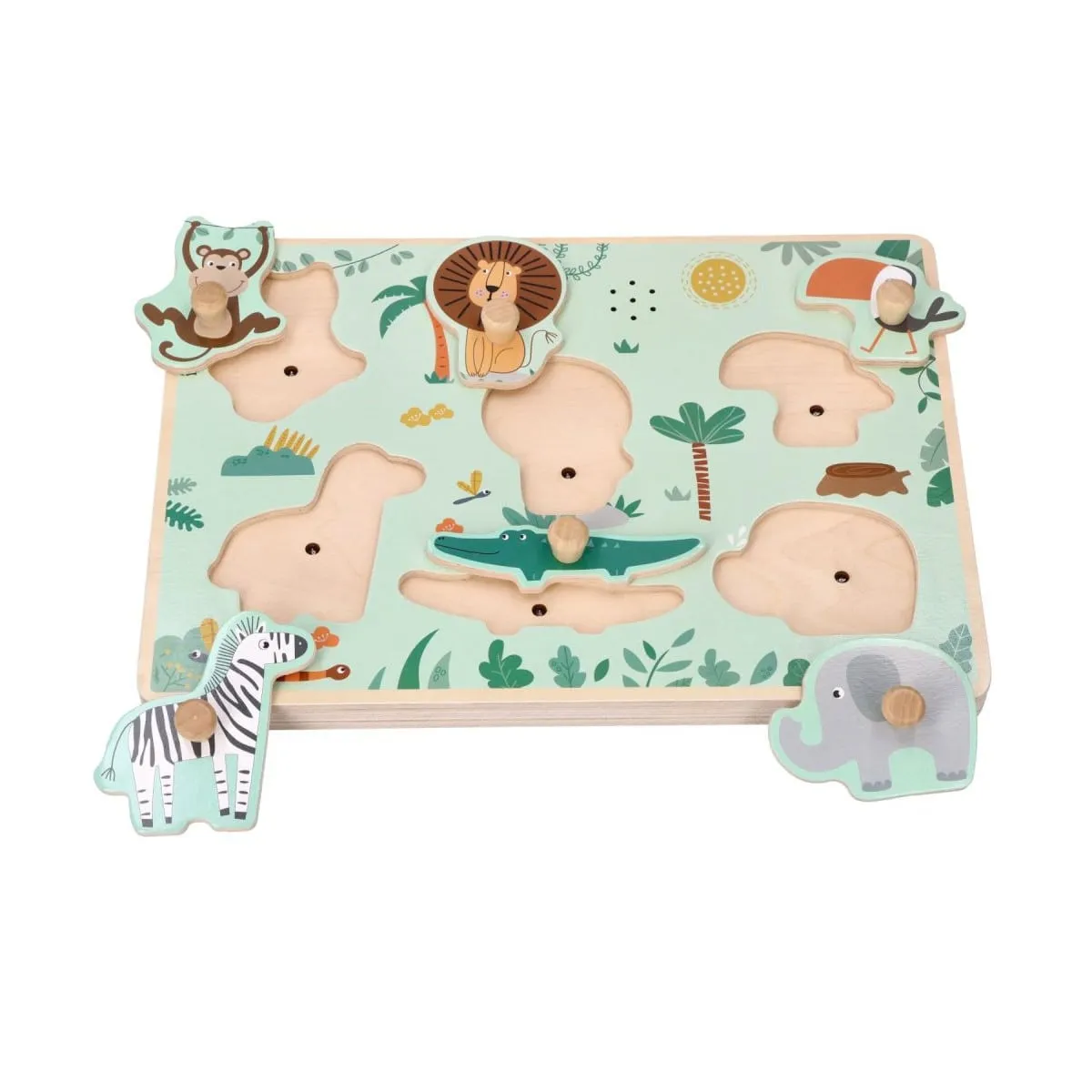 Dźwiękowa układanka zachwyci malucha odgłosami mieszkańców safari. Prosta forma, ładne i estetyczne kolory oraz urocze zwierzaki zachęcają do wesołej i sensorycznej zabawy. Puzzle z uchwytami zostały idealnie dopasowane do małych rączek.