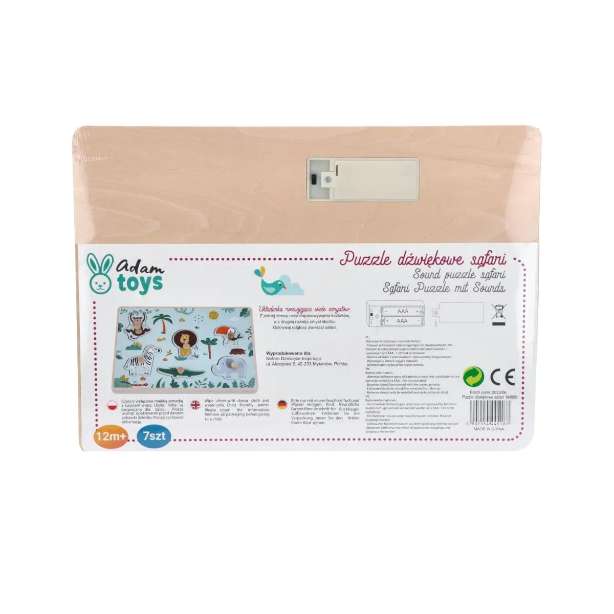 Drewniana podstawa z modułem dźwiękowym, elementy puzzle przedstawiające zwierzęta safari oraz baterie do uruchomienia dźwięków.