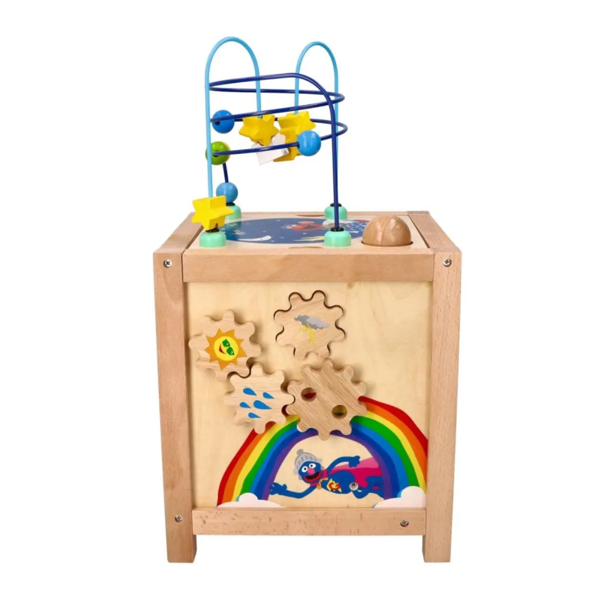 Kompletne centrum aktywności z pętlą motoryczną, elementami do sortowania i obracania, ozdobione bohaterami Ulicy Sezamkowej.