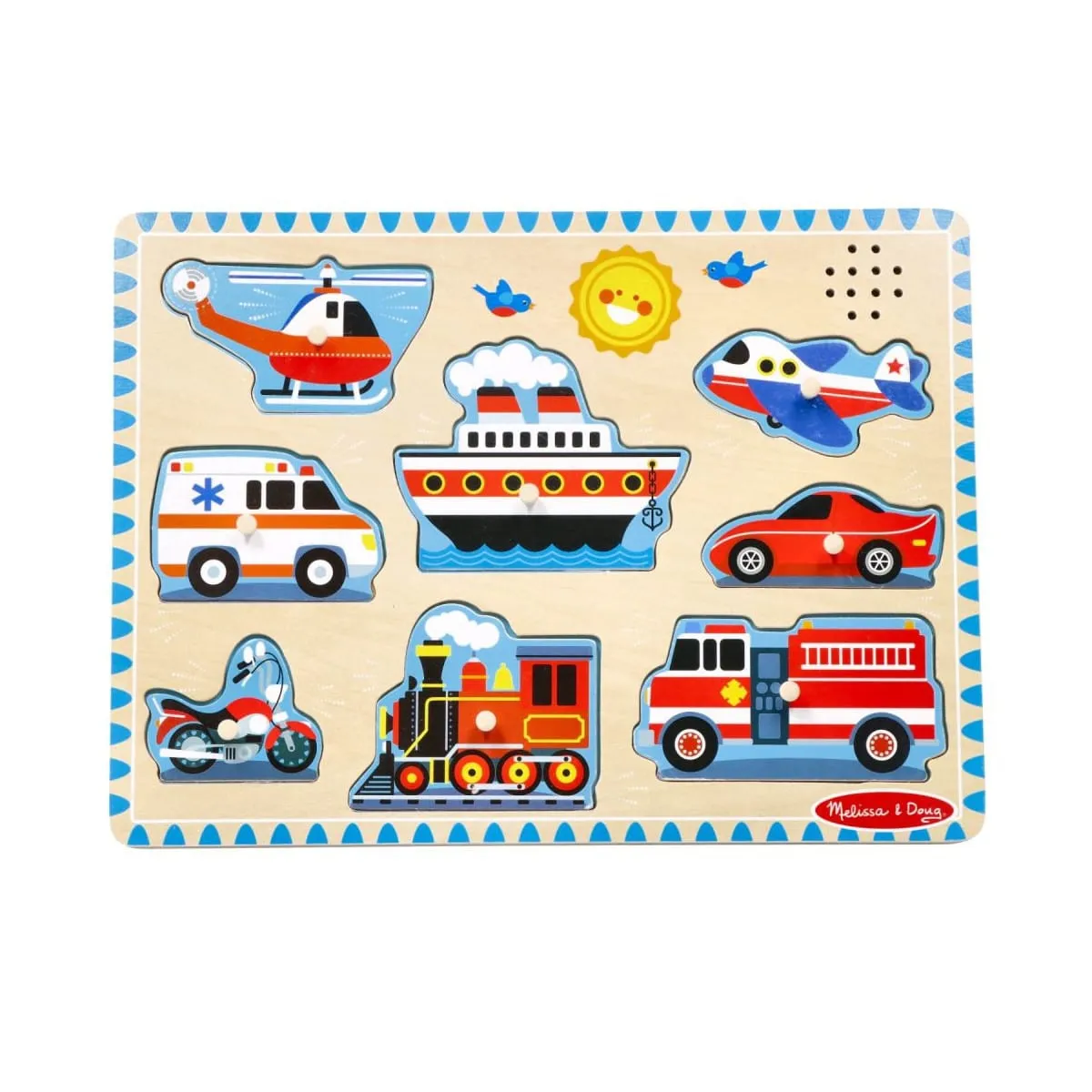 Drewniane puzzle dźwiękowe z 9 pojazdami, które wydają charakterystyczne odgłosy po prawidłowym dopasowaniu. Edukacyjna zabawka rozwijająca zmysły i zdolności manualne. Układanka dzieci od 2 roku życia. Każdy mały fan pojazdów będzie zachwycony!