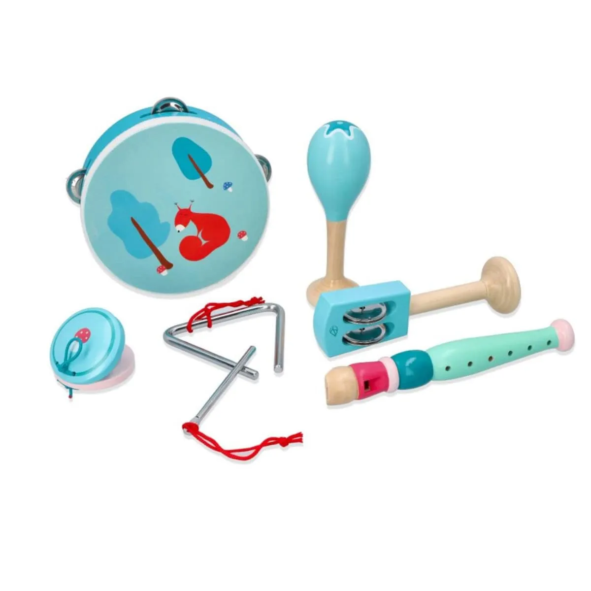 Zestaw muzyczny z wiewiórką od Adam Toys to komplet 7 kolorowych instrumentów dla dzieci. W drewnianej skrzynce znajdują się: tamburyn, flet, marakas, kastaniety, dzwonki, trójkąt muzyczny - wszystko w uroczej, miętowej kolorystyce z leśnymi motywami.