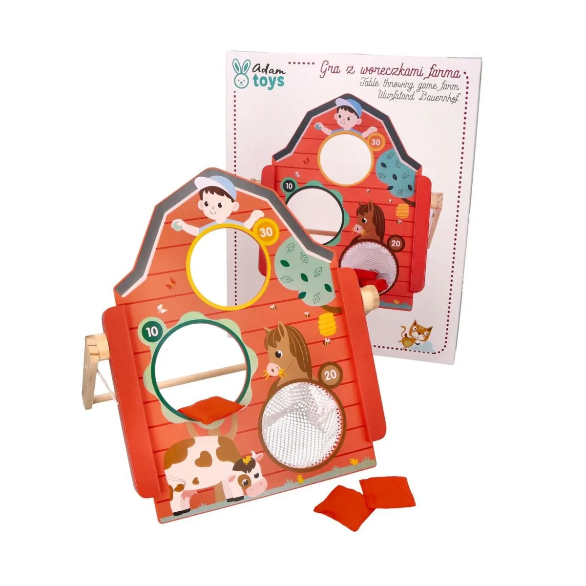 Gra zręcznościowa z motywem farmy, idealna do zabawy w domu i na zewnątrz. Składana drewniana tarcza z trzema otworami punktowanymi oraz 3 czerwone woreczki. Rozwija celność, umiejętności liczenia i motorykę. Przeznaczona dla dzieci od 3 roku życia.