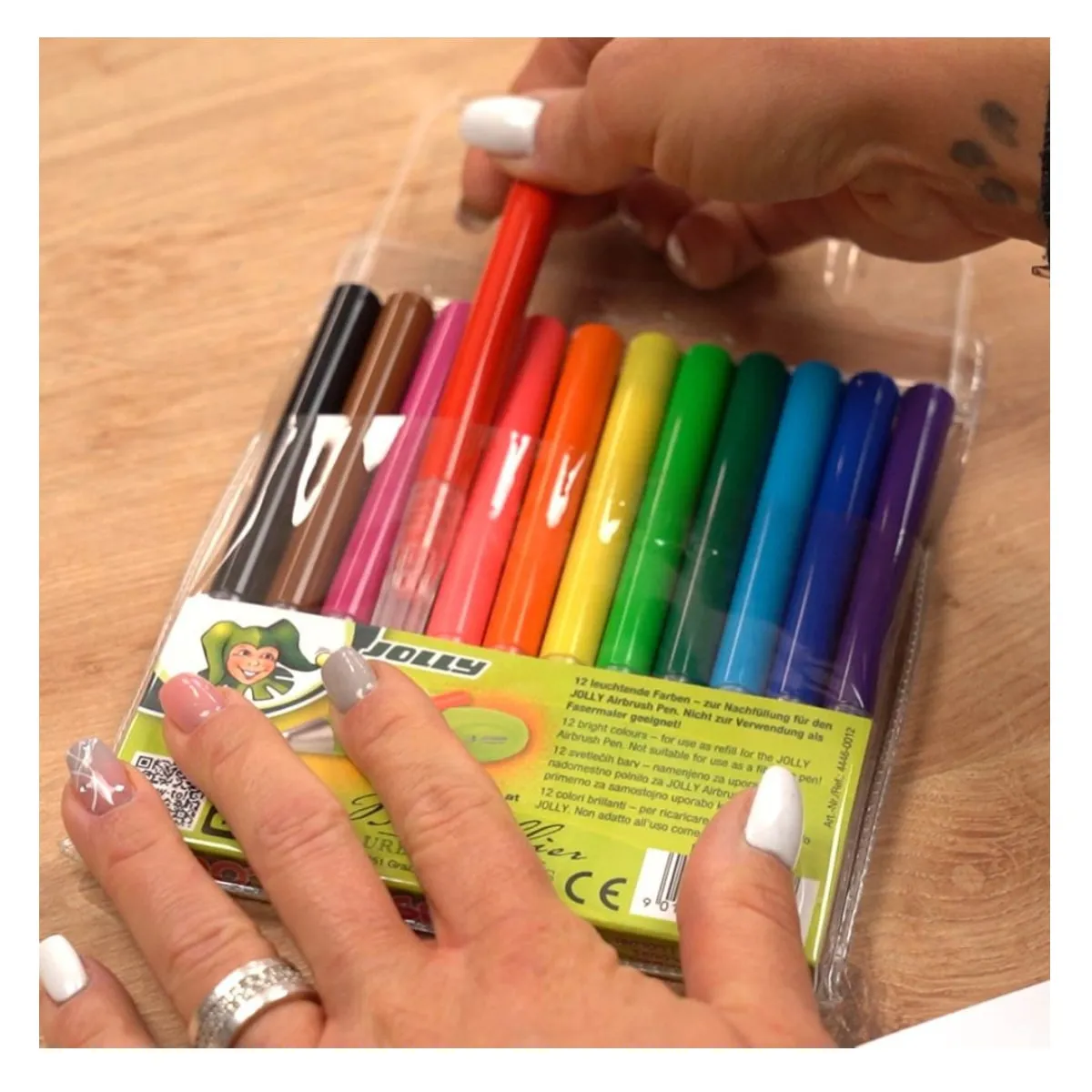12 kolorowych wkładów-markerów do AirBrush Fun Jolly. Atrament zmywalny, nietoksyczny, bezpieczny dla dzieci. Opakowanie pozwala na wygodne przechowywanie i szybką identyfikację kolorów.